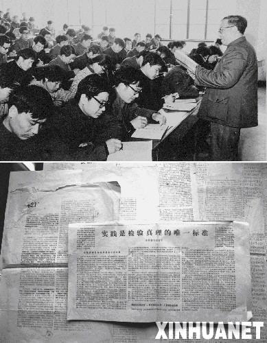 上圖:1979年《實(shí)踐是檢驗(yàn)真理的唯一標(biāo)準(zhǔn)》的初稿作者胡福明在南京大學(xué)哲學(xué)系講課。 下圖:刊有《實(shí)踐是檢驗(yàn)真理的唯一標(biāo)準(zhǔn)》文章的《光明日?qǐng)?bào)》和修改過的清樣。 新華社發(fā)