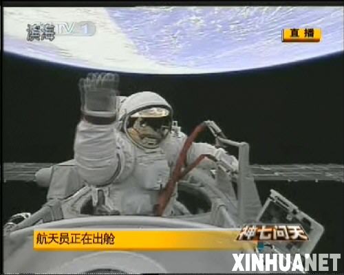 2008年9月27日,執(zhí)行神舟七號(hào)載人航天飛行出艙活動(dòng)任務(wù)的航天員翟志剛出艙后揮手致意。 新華社發(fā)(電視截圖)