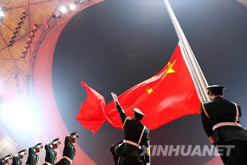 2008年8月8日,第29屆夏季奧林匹克運(yùn)動(dòng)會(huì)在國家體育場(chǎng)隆重開幕。這是中華人民共和國國旗在國家體育場(chǎng)升起。新華社記者任隴攝