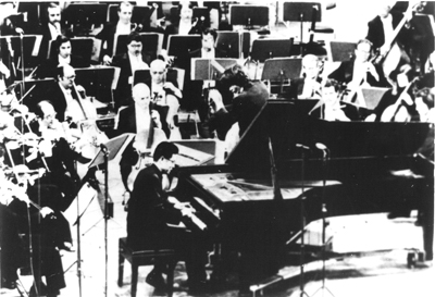 1979年劉詩昆在美國同著名指揮小澤征爾指揮下的美國波士頓交響樂作演奏鋼琴協(xié)奏曲。