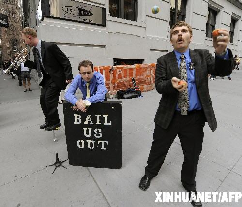 2008年10月14日 失業(yè)人員華爾街街頭賣藝 10月13日,在美國紐約的華爾街,幾名失業(yè)的金融業(yè)從業(yè)人員在街頭賣藝掙錢。 新華社/法新