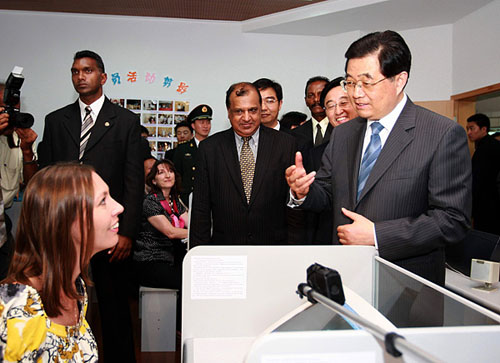 2月17日,正在毛里求斯訪問的國家主席胡錦濤參觀中國文化中心。這是胡錦濤主席同正在這里學習漢語的學員親切交談。新華社記者 鞠鵬攝