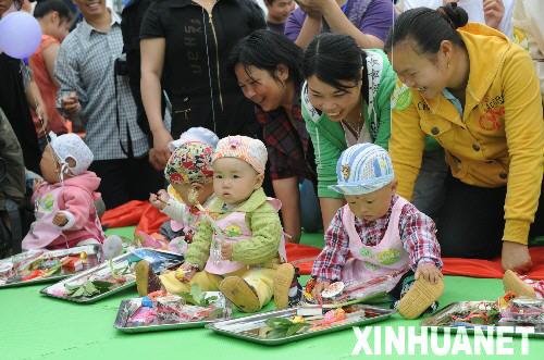 2009年5月13日 108個地震“羅漢娃”舉行生日抓周會 5月13日,地震“羅漢娃”正在抓周。 2008年5月12日,汶川大地震發(fā)生后,四川省什邡市婦幼保健院被震成危房,相鄰的千年古剎羅漢寺當天收留了將要臨產(chǎn)的全部孕婦。羅漢寺內(nèi),禪床變產(chǎn)床,廚房成產(chǎn)房,從5月13日清晨到8月7日什邡市婦幼保健院板房區(qū)建好的兩個多月里,羅漢寺內(nèi)先后誕生了108個孩子,他們被人們親切地稱為“羅漢娃”。2009年5月13日,在什邡市剛剛落成的由北京援建的北京小學操場上,108個“羅漢娃”舉行了集體生日抓周活動。許多愛心人士不遠千里來到現(xiàn)場,與寶寶們結對,拜認干爹干媽。