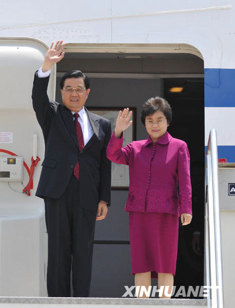 7月5日,中國國家主席胡錦濤抵達(dá)羅馬,開始對(duì)意大利進(jìn)行國事訪問,并將出席9日在意大利拉奎拉舉行的八國集團(tuán)同發(fā)展中國家領(lǐng)導(dǎo)人對(duì)話會(huì)議。這是胡錦濤和夫人劉永清向前來歡迎的人們揮手致意。新華社記者黃敬文攝