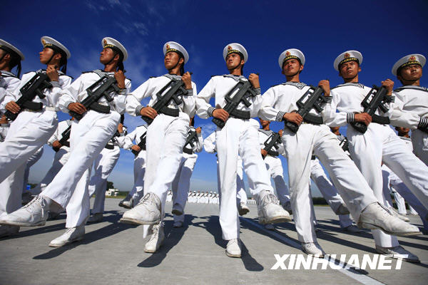 海軍水兵方隊(duì)在烈日下進(jìn)行嚴(yán)格訓(xùn)練(9月13日攝)。新中國成立60周年國慶閱兵式即將來臨,練兵場(chǎng)上的受閱官兵們精神飽滿、氣勢(shì)昂揚(yáng),他們?cè)谟?xùn)練中精雕細(xì)刻,科學(xué)訓(xùn)練,決心以最嚴(yán)整的軍姿接受檢閱。新華社記者查春明攝