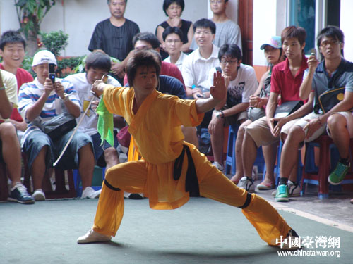 中國(guó)臺(tái)灣網(wǎng)8月10日福建莆田消息 首屆兩岸青年聯(lián)歡節(jié)“海峽西岸青年歡樂行”莆田參觀考察組因受到“寶霞”、“桑美”兩臺(tái)風(fēng)的影響,在上午取消了赴湄洲島參訪祭拜媽祖祖廟活動(dòng)。在莆田市接待工作組及臺(tái)灣十杰青年基金會(huì)的協(xié)調(diào)安排下,參觀南少林,觀看少林武術(shù)的表演成為昨天下午的新內(nèi)容。
