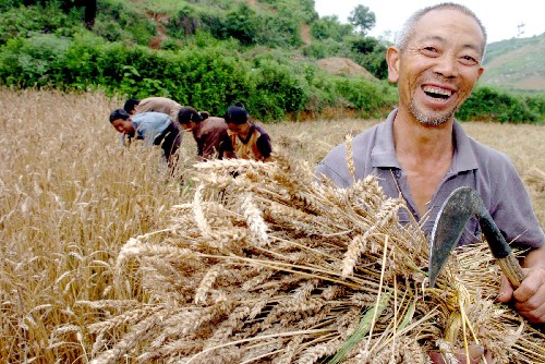 貴州省惠水縣橋洞村農(nóng)民羅林壽在喜收小麥(2005年5月攝)。新華社發(fā)