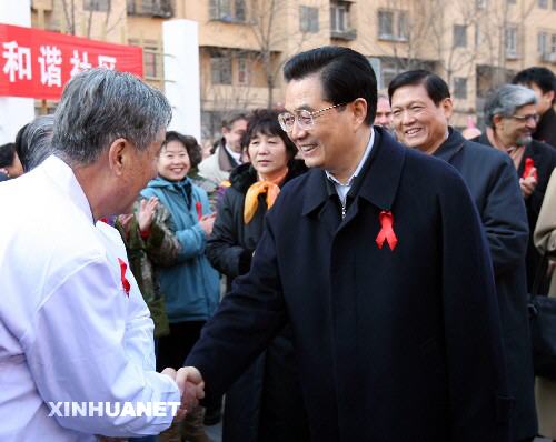 11月30日,在第20個(gè)世界艾滋病日到來(lái)之際,中共中央總書記、國(guó)家主席、中央軍委主席胡錦濤來(lái)到北京市朝陽(yáng)區(qū)考察艾滋病防治工作。這是胡錦濤在朝陽(yáng)區(qū)秀水園社區(qū)同參加宣傳咨詢活動(dòng)的防治艾滋病專家親切交談。新華社記者馬占成攝