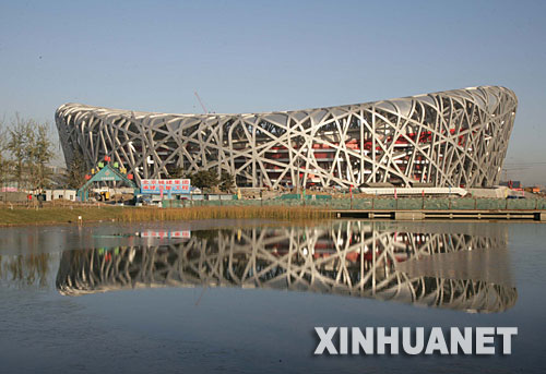 “鳥巢”倒映在水中。北京2008年奧運(yùn)會(huì)主會(huì)場(chǎng)――國(guó)家體育場(chǎng)(“鳥巢”)鋼筋混凝土結(jié)構(gòu)、鋼結(jié)構(gòu)、膜結(jié)構(gòu)三大結(jié)構(gòu)工程日前完工,并開始安裝座椅。 新華社發(fā)