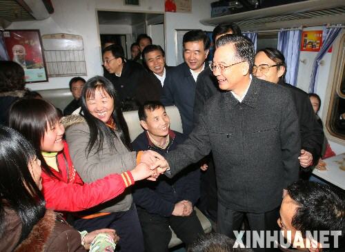 1月30日,中共中央政治局常委、國(guó)務(wù)院總理溫家寶在廣州火車站看望旅客。這是溫家寶總理登上一列即將開往武昌的列車與旅客交談。這列火車是從南昌緊急調(diào)來支援廣州車站的。 新華社記者姚大偉攝