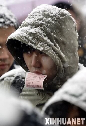 1月27日,一名旅客頂著大雪在合肥火車站進(jìn)站候車。 當(dāng)日,合肥再次降大到暴雪,致使公路、民航停運(yùn)。許多準(zhǔn)備回家過年的人顧不得人多擁擠、旅途勞累,冒著大雪涌入火車站,以求早日與家人團(tuán)聚。 新華社記者 李健 攝