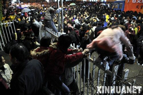 1月30日,廣州火車站附近的一些滯留旅客在翻越欄桿。當(dāng)日晚8時(shí)左右,約2萬(wàn)名滯留旅客在廣交會(huì)流花展館安置點(diǎn)七號(hào)門不足1000平方米的小廣場(chǎng)發(fā)生擁擠現(xiàn)象。廣州警方采取緊急措施,把離七號(hào)門最近的一個(gè)展館內(nèi)的旅客轉(zhuǎn)移至別處,將擁擠在小廣場(chǎng)上的旅客分批安置進(jìn)室內(nèi)避雨。據(jù)了解,雖然廣州市政府設(shè)立了13個(gè)滯留旅客安置點(diǎn),但是很多旅客紛紛涌向離廣州火車站僅百米之遙的廣交會(huì)流花展館,而該展館安置了6萬(wàn)余名旅客,已經(jīng)爆滿。 新華社記者 劉大偉 攝