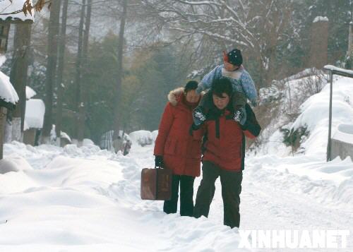 1月30日,一家三口在105國(guó)道岳西石關(guān)段涉雪前行。 近日,地處大別山區(qū)的安徽岳西縣遭持續(xù)暴雪襲擊,該縣通往外界的唯一通道――105國(guó)道姚河段至溫泉段因結(jié)冰積雪嚴(yán)重而中斷。一些農(nóng)民工歸家心切,不顧雪厚山高,徒步返鄉(xiāng)。 新華社發(fā)(儲(chǔ)永志 攝)