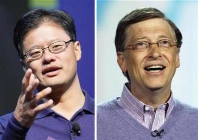 左為雅虎創(chuàng)辦人及現(xiàn)任CEO楊致遠(yuǎn),右為微軟董事長(zhǎng)比爾·蓋茨