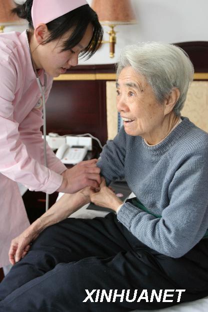 圖片說(shuō)明:1月25日,在養(yǎng)老基地頤年山莊內(nèi),一名護(hù)理員在為一位退休老人測(cè)量血壓。近日,中國(guó)資產(chǎn)經(jīng)營(yíng)管理公司利用央企閑置資產(chǎn)改造建立的首家養(yǎng)老基地――城通頤年山莊在北京落成,并迎來(lái)了首批來(lái)此居住養(yǎng)老的退休老人。2007年6月,在軍工企業(yè)改制和社會(huì)老齡化的大背景下,中資公司投資3000萬(wàn)元,將閑置多年的北京燕京汽車廠一分廠舊廠房加以改造,發(fā)展養(yǎng)老產(chǎn)業(yè),并積極探索多種養(yǎng)老模式。此舉既盤活了企業(yè)資產(chǎn),又為社會(huì)養(yǎng)老開辟了新路子。(新華社記者 李明放 攝)