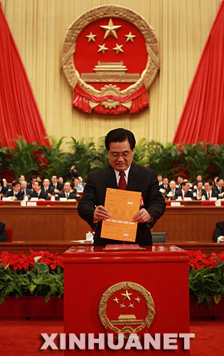 3月15日,十一屆全國(guó)人大一次會(huì)議在北京人民大會(huì)堂舉行第五次全體會(huì)議,選舉第十一屆全國(guó)人民代表大會(huì)常務(wù)委員會(huì)委員長(zhǎng)、副委員長(zhǎng)、秘書(shū)長(zhǎng);選舉第十一屆全國(guó)人民代表大會(huì)常務(wù)委員會(huì)委員;選舉中華人民共和國(guó)主席、副主席;選舉中華人民共和國(guó)中央軍事委員會(huì)主席。這是胡錦濤在投票。 新華社記者鞠鵬攝