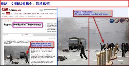 同樣在17日,美國有線電視新聞網(wǎng)(CNN)和法新社在各自網(wǎng)站上使用了一張描述一輛車正向兩名平民駛來的圖片,雖然CNN網(wǎng)站的圖片說明寫的是“藏人向軍車投擲石塊”,但圖中卻看不見類似場景。事實(shí)上,當(dāng)時(shí)軍車旁有約10名暴徒在向軍車投擲石塊,只是CNN和法新社未選取這種客觀描述暴徒惡行的照片。