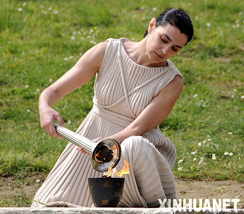 3月22日,扮演最高女祭司的瑪利亞·娜芙普利都在彩排儀式上點(diǎn)燃火種罐。當(dāng)日,希臘奧林匹亞再次舉行北京奧運(yùn)會(huì)圣火采集儀式彩排,并成功試采到新的火種。 新華社記者 吳曉凌攝