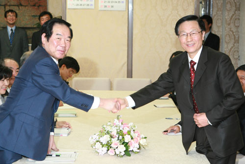 3月23日,中國(guó)財(cái)政部長(zhǎng)謝旭人(右)和日本財(cái)務(wù)大臣額賀福志郎(左)在日本首都東京舉行會(huì)談。當(dāng)天,第二次中日財(cái)長(zhǎng)對(duì)話會(huì)議在東京舉行。新華社記者 任正來(lái) 攝
