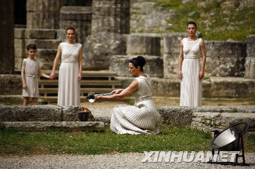 3月23日,扮演最高女祭司的瑪利亞·娜芙普利都(左)在彩排儀式上高高舉起火種罐。當(dāng)日,北京奧運(yùn)會(huì)圣火采集儀式在奧林匹亞進(jìn)行最后一次彩排。新華社記者畢明明攝