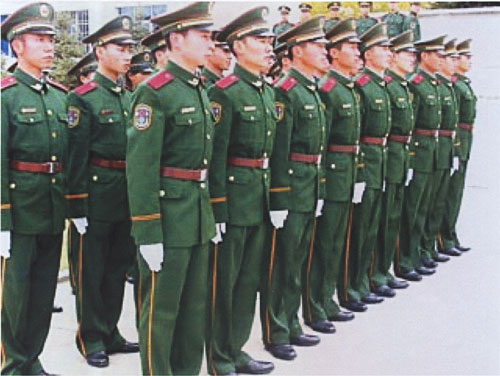 一、著裝的年代不符。武警部隊自2005年1月1日起,全體官兵統(tǒng)一佩戴胸標和臂章,而照片上武警士兵的著裝既無胸標,也無臂章,該照片顯然是2005年1月1日之前所拍。自2006年5月1日始,武警部隊戰(zhàn)士統(tǒng)一換著05式服裝,其服裝材質(zhì)由布料改為仿毛面料,挺括舒展,而照片上顯示武警戰(zhàn)士穿著的是87式布料服裝。顯然,照片上反映的服裝與部隊現(xiàn)行著裝不是一個年代。