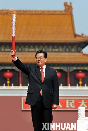 3月31日,中共中央總書記、國(guó)家主席胡錦濤出席北京2008年奧運(yùn)圣火歡迎儀式暨火炬接力啟動(dòng)儀式。這是胡錦濤點(diǎn)燃圣火盆后,高高舉起奧運(yùn)火炬,向現(xiàn)場(chǎng)的中外來(lái)賓和各界群眾致意。 新華社記者樊如鈞攝