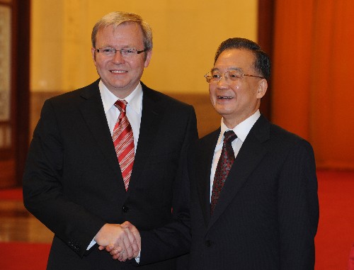 4月10日,中國國務(wù)院總理溫家寶在北京人民大會堂與澳大利亞總理陸克文舉行會談。 新華社記者黃敬文攝