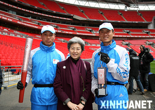 4月6日,在圣火傳遞起點(diǎn)――溫布利體育場(chǎng),中國(guó)駐英國(guó)大使傅瑩(中)與兩名護(hù)火手合影。當(dāng)日,北京奧運(yùn)會(huì)圣火傳遞活動(dòng)在英國(guó)倫敦舉行,這是北京奧運(yùn)會(huì)圣火境外傳遞的第四站。新華社記者 謝秀棟 攝
