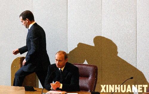 5月8日,在俄羅斯首都莫斯科,俄總統(tǒng)梅德韋杰夫(左)與前總統(tǒng)普京在國家杜馬(議會下院)出席非例行全體會議。當日,俄杜馬以392票贊成、56票反對和零票棄權的表決結果,批準了新總統(tǒng)梅德韋杰夫對普京出任新政府總理的提名。梅德韋杰夫已簽署命令,任命普京為俄新一屆政府總理。 新華社記者沈伯韓攝