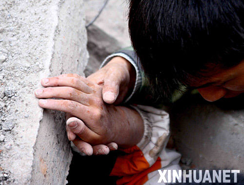 5月13日,救護人員在漢旺鎮(zhèn)武都小學(xué)廢墟上搶救幸存的小學(xué)生。四川綿竹市漢旺鎮(zhèn)武都小學(xué)的教學(xué)樓在地震中倒塌,眾多師生被埋在倒塌的校舍中。救援行動正在積極展開。 新華社記者 陳建力攝