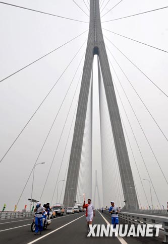 5月25日,火炬手朱相桂在蘇通大橋上進行傳遞。新華社記者 安治平 攝