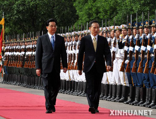 會(huì)談前,胡錦濤主席在人民大會(huì)堂東門(mén)外廣場(chǎng)為李明博總統(tǒng)訪華舉行歡迎儀式。胡錦濤主席夫人劉永清、全國(guó)人大常委會(huì)副委員長(zhǎng)陳昌智、國(guó)務(wù)委員戴秉國(guó)、全國(guó)政協(xié)副主席黃孟復(fù)、民進(jìn)中央副主席王佐書(shū)、外交部部長(zhǎng)楊潔篪、教育部部長(zhǎng)周濟(jì)、科技部部長(zhǎng)萬(wàn)鋼、商務(wù)部部長(zhǎng)陳德銘、中國(guó)駐韓國(guó)大使寧賦魁等出席歡迎儀式。