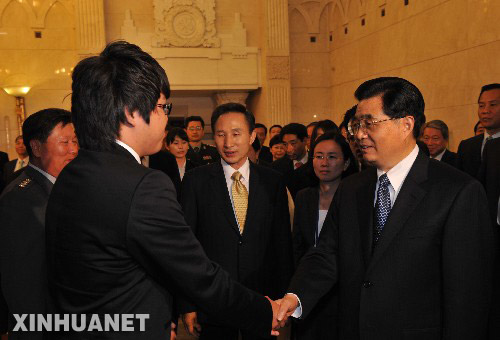 5月27日,國(guó)家主席胡錦濤與來(lái)訪的韓國(guó)總統(tǒng)李明博共同會(huì)見(jiàn)參加中國(guó)四川汶川大地震救援的韓國(guó)救援隊(duì)隊(duì)長(zhǎng)金永錫(左一)和志愿者代表金珍鎬(左二)。 新華社記者 樊如鈞 攝