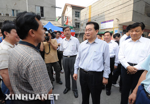 隨后,李長春頂著烈日趕往德陽市羅江縣金山鎮(zhèn)。他來到一個受災(zāi)群眾安置點,關(guān)切地詢問受災(zāi)群眾吃飯、飲水、居住、上學(xué)等方面情況。他囑咐當(dāng)?shù)馗刹恳钊爰氈碌刈龊盟枷胝喂ぷ鳎貏e要做好遇難者家屬和受傷人員的心理安撫和思想疏導(dǎo)工作,幫助他們排憂解難,堅定戰(zhàn)勝災(zāi)難的信心。