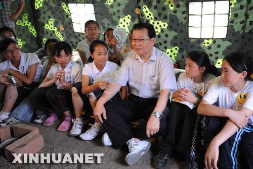 這是6月2日,李長春專程趕到設(shè)在長虹培訓(xùn)中心的北川中學(xué)臨時學(xué)校,走進教室,看望在這里復(fù)課的學(xué)生。 新華社記者 李學(xué)仁 攝
