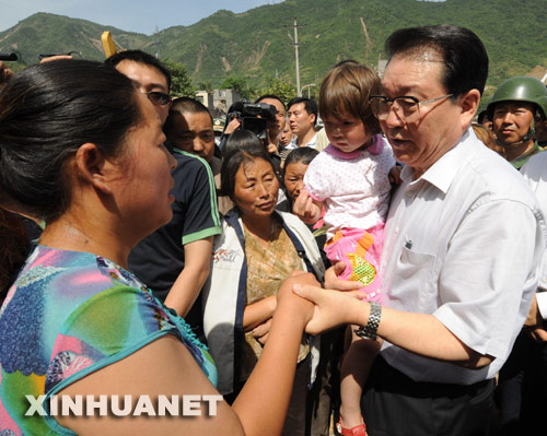 這是6月2日,李長春在平武縣南壩鎮(zhèn)察看災(zāi)情,慰問災(zāi)區(qū)干部群眾和救援人員,指導(dǎo)抗震救災(zāi)工作。 新華社記者 李學(xué)仁 攝