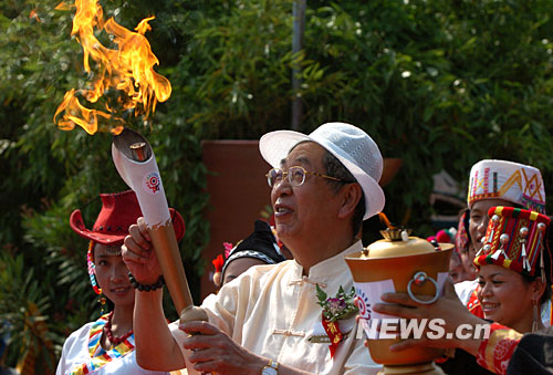 6月11日,全國(guó)人大常委會(huì)原副委員長(zhǎng)許嘉璐點(diǎn)燃“中華56民族之歌”音樂(lè)火炬。
