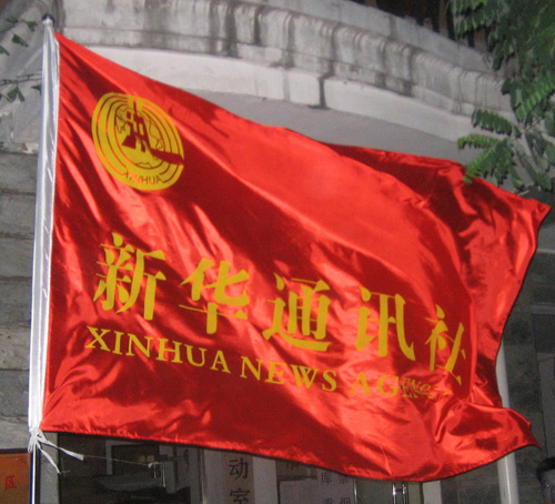 新華社社旗飄揚(yáng)在新華社抗震救災(zāi)報(bào)道前方指揮部(劉靜平 攝)