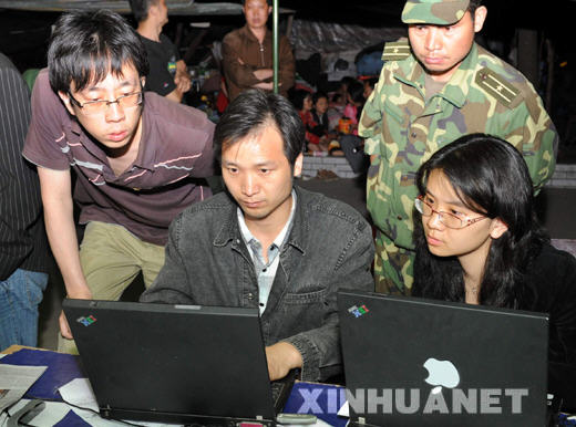 2008年5月14日,新華社女記者崔靜(右一)、儲(chǔ)國強(qiáng)(左二)在青川縣震區(qū)的帳篷里發(fā)稿。 新華社記者 陶明 攝