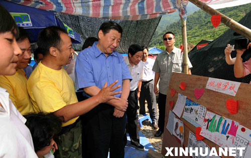 6月27日至29日,習(xí)近平和同行的中共中央政治局委員、中央書記處書記、中央組織部部長李源潮,在四川省委書記劉奇葆、省長蔣巨峰等陪同下,深入游仙、平武、北川、江油、都江堰、汶川等災(zāi)區(qū),看望慰問受災(zāi)群眾、基層黨員干部、各方面救災(zāi)人員和組工干部,調(diào)研黨建工作。在映秀鎮(zhèn)213國道搶通現(xiàn)場,習(xí)近平親切看望施工人員,鼓勵(lì)他們再接再厲,盡早打通這個(gè)交通生命線。在受災(zāi)群眾安置點(diǎn),他走進(jìn)一個(gè)個(gè)帳篷和一間間活動(dòng)板房,詳細(xì)詢問群眾吃飯、購物、就醫(yī)等方便不方便,還有什么困難。他說,妥善安置受災(zāi)群眾是當(dāng)前抗震救災(zāi)工作的重中之重,一定要抓緊、抓實(shí)、抓細(xì)。習(xí)近平要求在受災(zāi)群眾安置點(diǎn),要盡可能搞好公共服務(wù)設(shè)施配套建設(shè),千方百計(jì)方便群眾生產(chǎn)生活。當(dāng)?shù)弥驗(yàn)?zāi)停課的學(xué)生大部分已恢復(fù)上課,習(xí)近平十分高興。在平武縣平通鎮(zhèn)臨時(shí)板房小學(xué)和北川縣桂溪鄉(xiāng)永利村小學(xué),他向?qū)W生贈(zèng)送課外讀物,勉勵(lì)小同學(xué)們從小好好學(xué)習(xí),長大后用自己的勤勞和智慧為建設(shè)家鄉(xiāng)、建設(shè)祖國作貢獻(xiàn)。習(xí)近平強(qiáng)調(diào),災(zāi)后恢復(fù)重建是一項(xiàng)長期艱巨的任務(wù),一定要把自力更生與對(duì)口支援結(jié)合起來,把政府主導(dǎo)與市場機(jī)制結(jié)合起來,充分調(diào)動(dòng)各方面的積極性。在山東、廣東兩省對(duì)口援建活動(dòng)板房工地,習(xí)近平看到中央對(duì)口支援的部署正在落實(shí),感到很欣慰。他希望各支援省市進(jìn)一步細(xì)化任務(wù)、落實(shí)責(zé)任、抓緊工作、確保質(zhì)量,不辜負(fù)中央的重托,不辜負(fù)災(zāi)區(qū)人民的期盼。