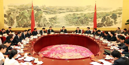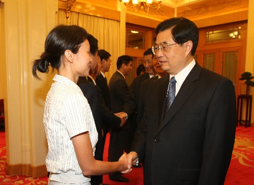 6月14日,黨和國(guó)家領(lǐng)導(dǎo)人胡錦濤、李長(zhǎng)春、習(xí)近平在北京中南海懷仁堂同團(tuán)中央新一屆領(lǐng)導(dǎo)班子成員和團(tuán)十六大部分代表座談。會(huì)前,胡錦濤總書記親切勉勵(lì)四川北川羌族自治縣團(tuán)委書記馬曉燕,要帶領(lǐng)災(zāi)區(qū)廣大團(tuán)員青年,在恢復(fù)重建中繼續(xù)發(fā)揮生力軍和突擊隊(duì)作用。 新華社發(fā)