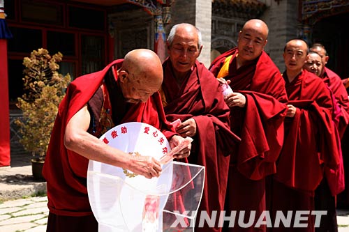 資料圖片:5月14日,塔爾寺僧眾在為災(zāi)區(qū)捐款。當(dāng)日,青海省著名佛教圣地塔爾寺近千名僧侶通過(guò)青海省紅十字會(huì)向四川地震災(zāi)區(qū)捐款10萬(wàn)元。 新華社記者 楊壽德 攝