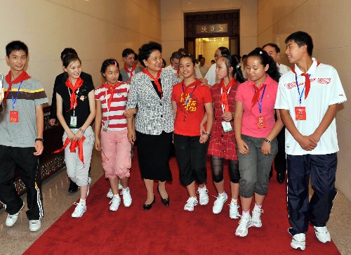8月2日,中共中央政治局委員、國務(wù)委員劉延?xùn)|在北京人民大會堂看望即將赴匈牙利、保加利亞療養(yǎng)的近100名四川汶川地震災(zāi)區(qū)中小學(xué)生。 新華社記者 樊如鈞 攝