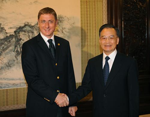 新華社北京8月14日電 (記者李詩佳)國務(wù)院總理溫家寶14日在中南海紫光閣會見了前來觀看北京奧運(yùn)會比賽的匈牙利總理久爾恰尼。