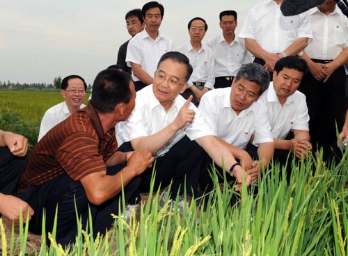 在寧夏回族自治區(qū)成立50周年大慶前夕,中共中央政治局常委、國(guó)務(wù)院總理溫家寶到寧夏深入工廠企業(yè)、田間地頭,走訪居民,親切慰問(wèn)各族干部群眾,共商寧夏未來(lái)發(fā)展大計(jì)。這是8月15日,溫家寶在賀蘭縣洪廣鎮(zhèn)優(yōu)質(zhì)糧產(chǎn)銷合作社了解水稻種植情況。(新華社記者饒愛民攝)