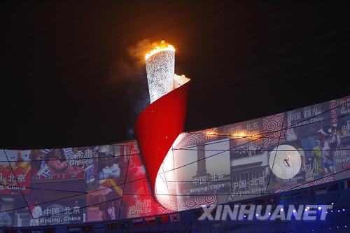 8月8日,第29屆夏季奧林匹克運動會在國家體育場隆重開幕。這是李寧點燃主火炬。新華社記者凡軍攝