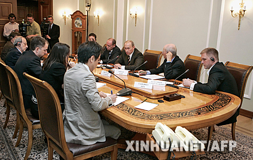 資料圖片:2007年6月1日,在俄羅斯首都莫斯科郊外的總統(tǒng)官邸,俄總統(tǒng)普京(右三)在出席八國集團(tuán)首腦會(huì)議前夕接受八國記者聯(lián)合采訪。 新華社/法新