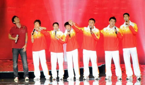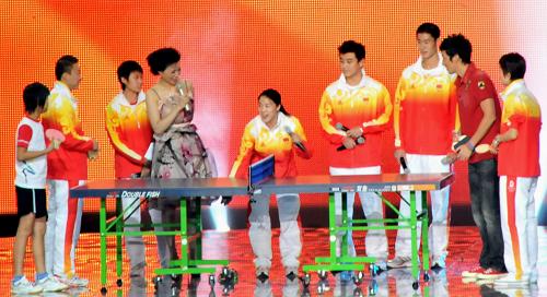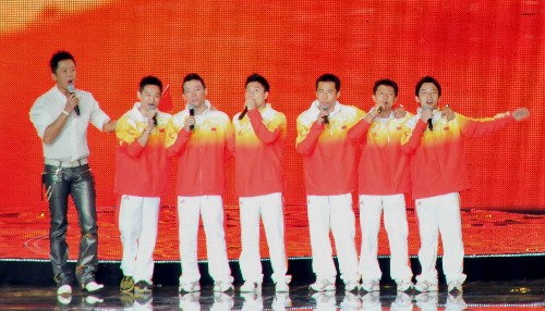 主辦方還請來劉歡、那英等內(nèi)地歌星現(xiàn)場高歌,乒乓球隊和體操隊的幾位金牌運動員在觀眾的強烈要求下獻唱歌曲,將晚會帶入高潮。