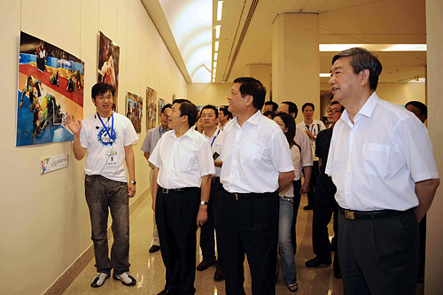 9月9日,中共中央政治局委員、北京市委書記、北京奧組委主席劉淇(前右二)來到中國美術(shù)館,參觀“分享光榮與夢想——2008北京奧運(yùn)會大型新聞圖片展”。新華社社長李從軍、副社長魯煒陪同參觀。 新華社記者王建華攝