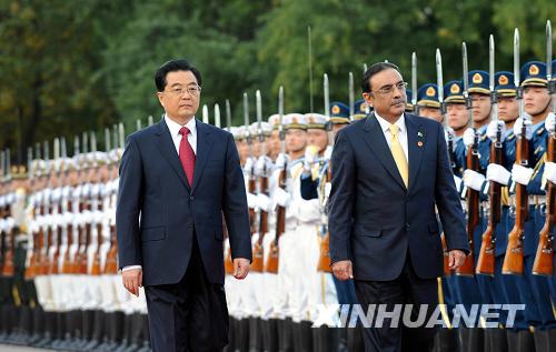 10月15日,國家主席胡錦濤在北京人民大會堂東門外廣場舉行儀式,歡迎巴基斯坦總統(tǒng)扎爾達(dá)里訪華。新華社記者 高潔 攝
